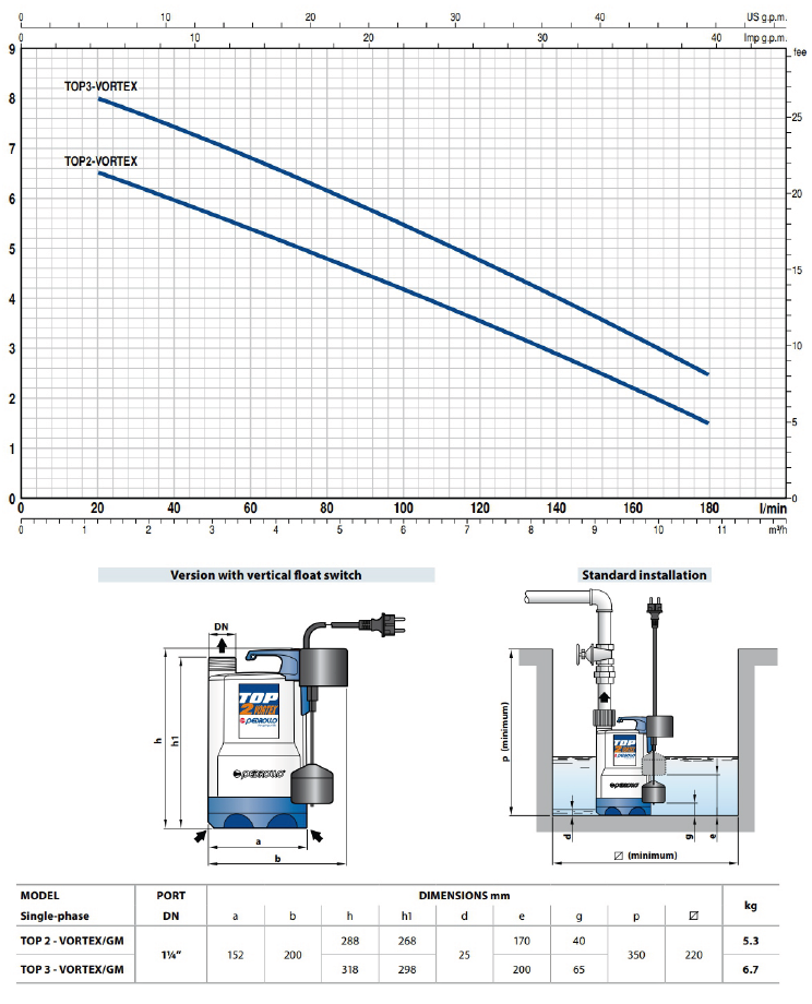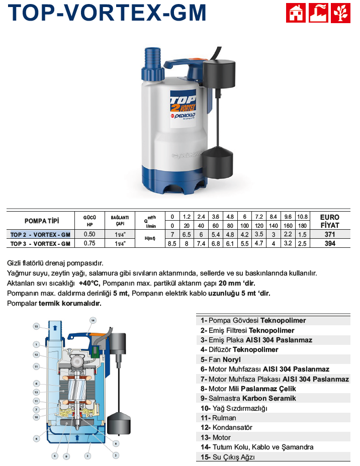 - TOP serisi, aşındırıcı parçacıklar olmadan temiz suyu boşaltmak için mükemmeldir. Motor soğutması ve çift şaft contası dahil olmak üzere yapı özellikleri kullanıcı dostu ve güvenli bir çalışma sağlar. Küçük, su basmış alanların (odalar, bodrumlar, garajlar) acil drenajı, ev suyunun atılması (bulaşık makineleri, çamaşır makineleri) ve haznelerin boşaltılması için önerilir.