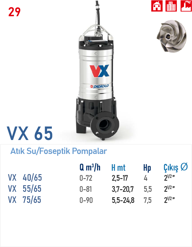 Ürün AdıDebi ( Q m³/h )Bas. Yük. (mSS)FiyatSatın AlVX 40/6572122, 5-15, 690.074,15 ₺ + KDVSepete Ekle 2756VX 55/6581123, 4, 7-1995.826,34 ₺ + KDVSepete Ekle 2932VX 75/6590125, 5-23, 699.682,93 ₺ + KDVSepete Ekle 3050