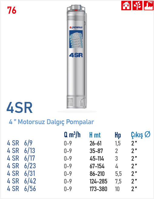 5, 91 35-83 480 5, 91 45-107 546 5, 91 67-148 710 5, 91 86-200 864 5, 91 124-276 1220 5, 91 173-365 1700 5, 91 26-58 426Ürün Adı Debi ( Q m³/h ) Bas. Yük. (mSS) Fiyat Satın Al 4 SR 6/13 15.687,80 ₺ + KDV4 SR 6/17 17.844,88 ₺ + KDV4 SR 6/23 23.204,88 ₺ + KDV4 SR 6/31 28.238,05 ₺ + KDV4 SR 6/42 39.873,17 ₺ + KDV4 SR 6/56 55.560,98 ₺ + KDV4 SR 6/9 13.922,93 ₺ + KDV